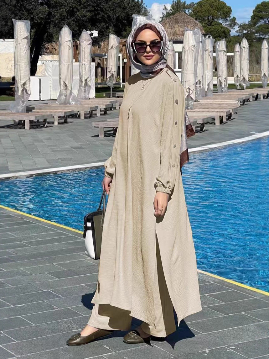 En stock, nouvelle tenue décontractée décontractée de couleur unie pour femmes musulmanes : boucle ronce dorée, poche ballonneuse, longue série